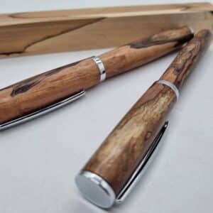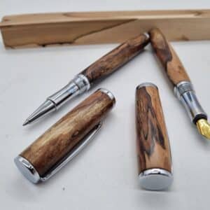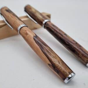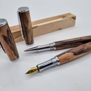Hochwertiger Füllerbausatz hergestellt von Heribert Lechner Modell Rosenheim junior. Der fertige Füller hat eine Länge von 14,5cm. Was hier zum Bau noch benötigt wird sind: Bushings auch hier im Shop erhältlich. Die Hülse für die Kappe hat einen Durchmesser von 12,25mm und eine Länge von 55mm. Die Hülse vom Stift hat einen Durchmesser von 9,75mm und eine Länge von 75,5mm. Die Feder und der Tintenleiter ist von der Schmidt Technology und hat eine sehr hohe Qualität. Zum Bohren für die Hülsen werden ein 10mm und ein 12,5mm Bohrer benötigt. Demnächst auch hier im Shop erhältlich. Die Feder ist vergoldet und hat eine Schriftbreite „M“. Eine reiche Auswahl an  Schöne Hölzer sowie Material für die perfekte Oberfläche finden Sie auch im Shop. Füller und Rollerball im Bild dienen nur als Muster.