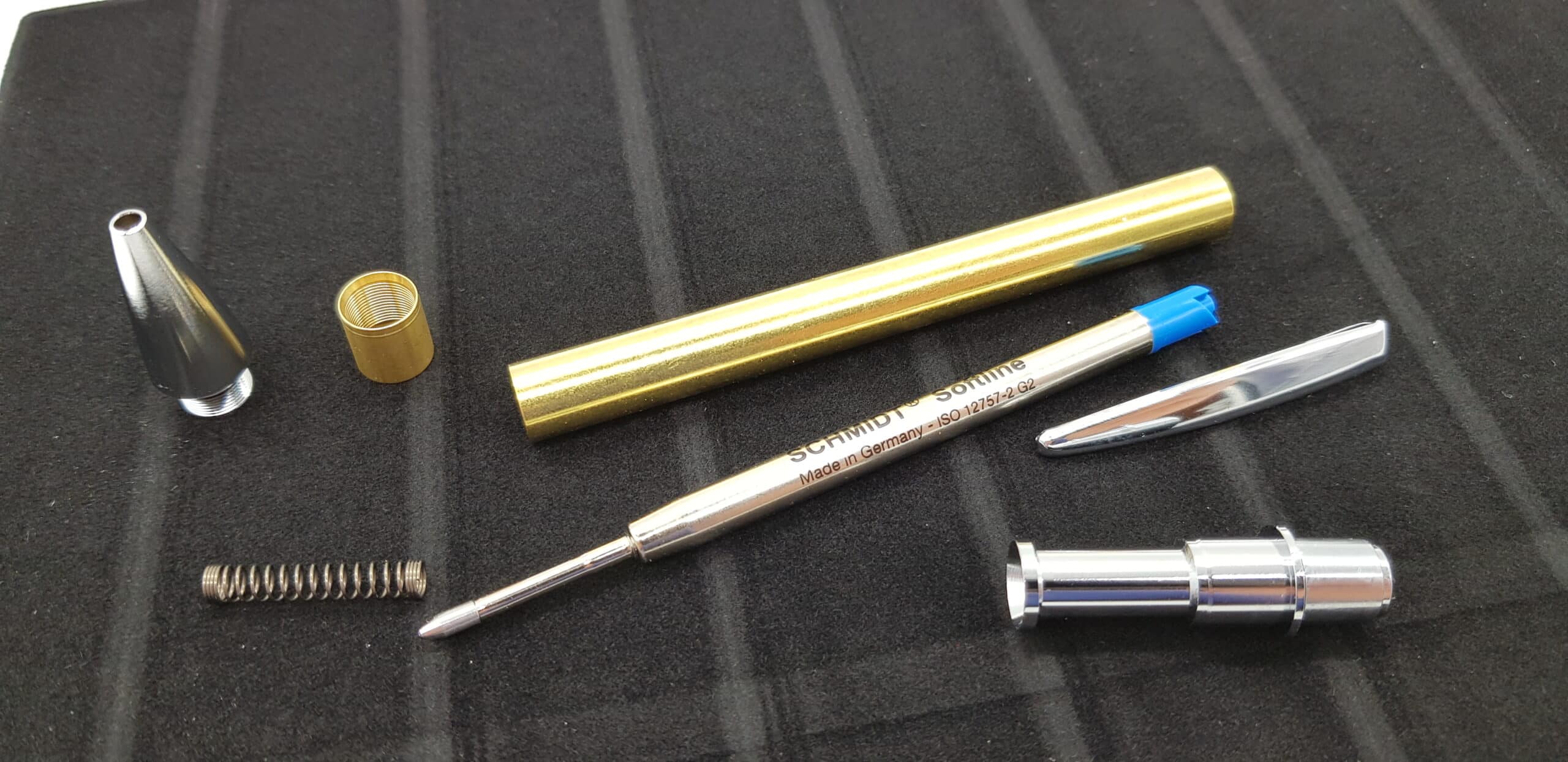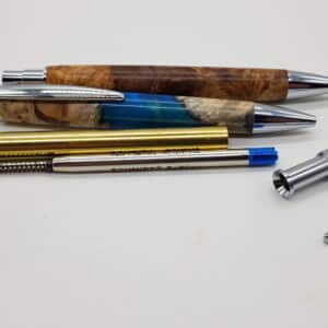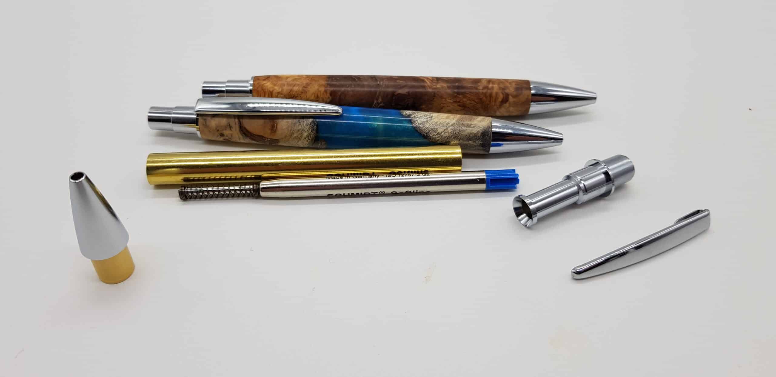Hochwertiger Klickkugelschreiber Hamburger Bausatz, der Bausatz enthält eine Mine Schmidt Softline G2, Schreibfarbe blau. Was Sie hier zum Bau noch benötigt wird sind: Bushings auch hier im Shop erhältlich, einen 9,5 mm Bohrer und ein Kantel mit der Länge von ca 90mm. Die Stifte im Bild dienen als Muster.