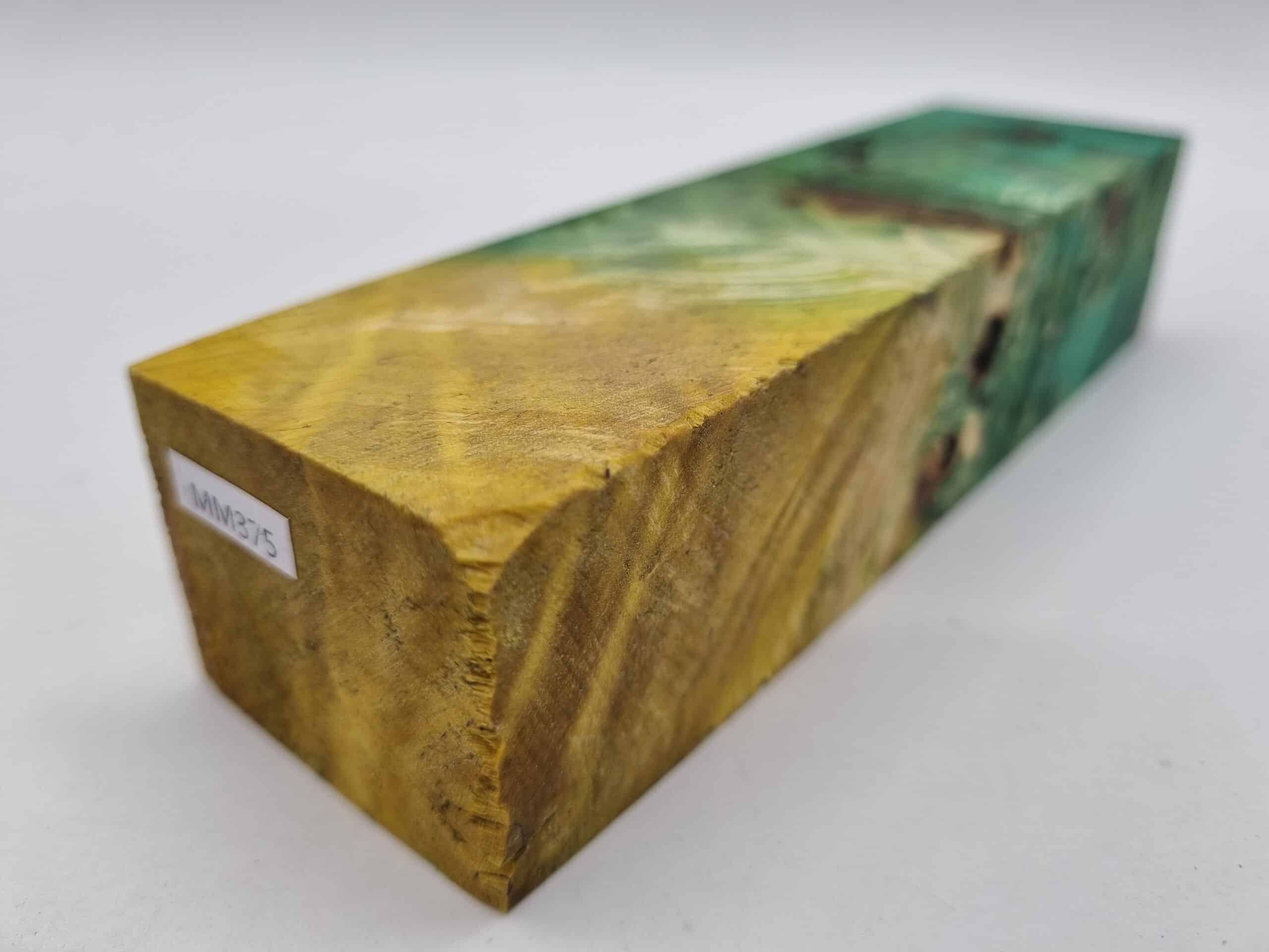 MM375 Griffblock Kastanienknolle grün gelb stabilisiert 42mm x 32mm x 145mm. Holz aus einer Knolle können Fehlstellen wie offene Maseraugen, Rindeneinwachsungen oder wuchstypische Risse enthalten. Diese kann man aber mit CA Kleber und Schleifstaub leicht füllen. Schleif-, Poliermittel und Finish ist auch hier erhältlich. Beim Kauf erhalten Sie exakt das abgebildete Stück.