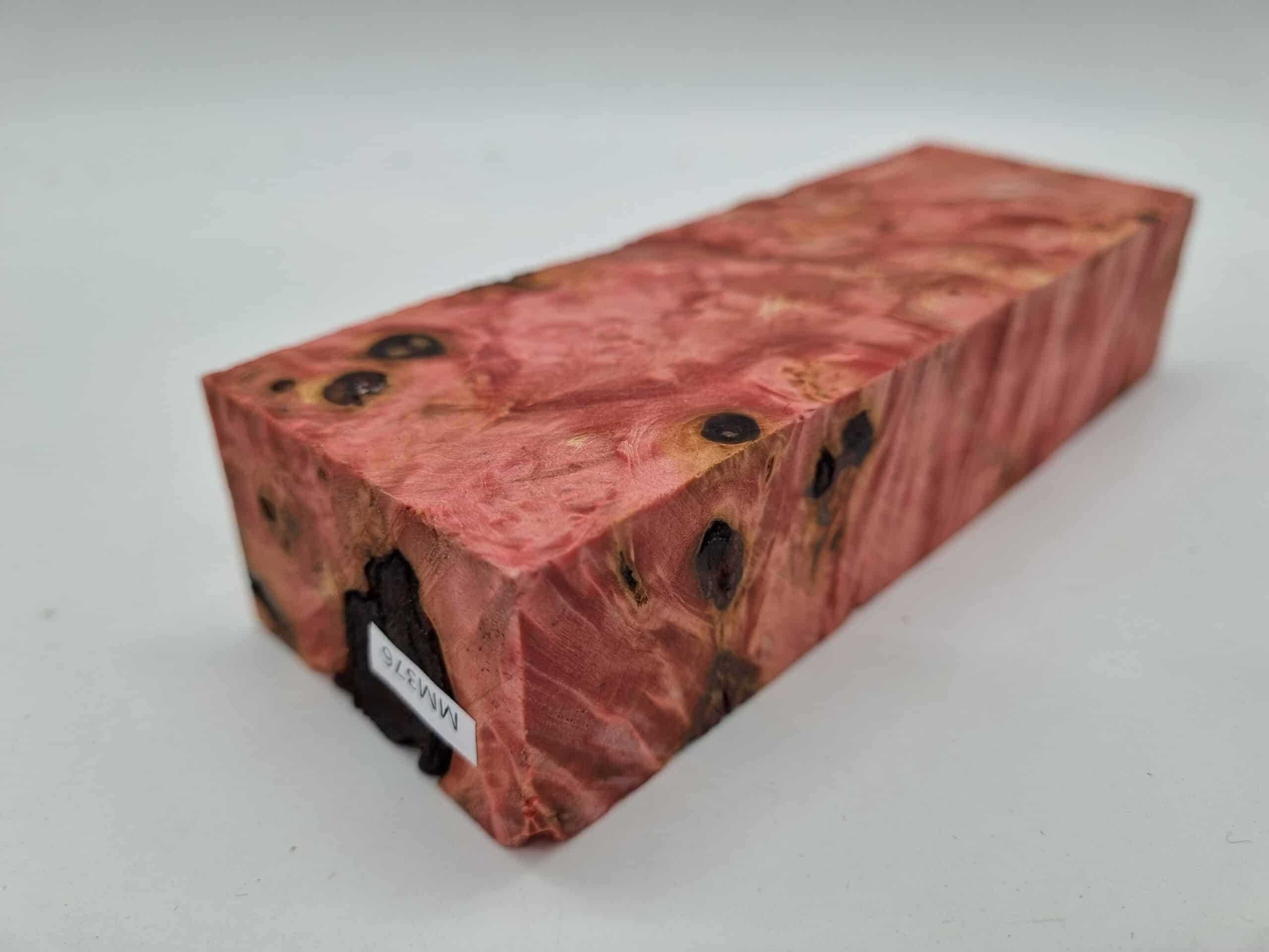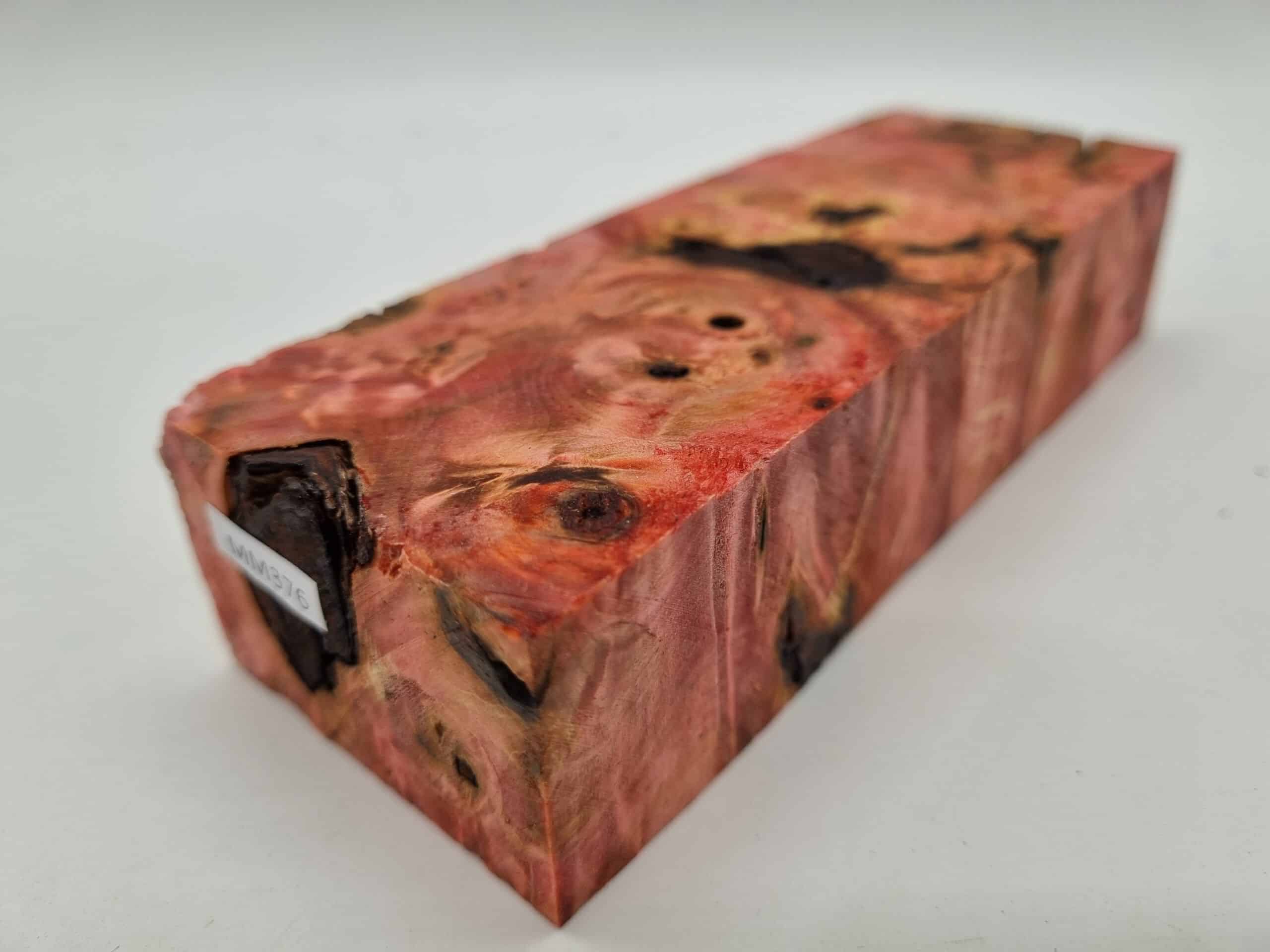 MM376 Griffblock Kastanienknolle rot stabilisiert 49mm x 32mm x 140mm. Holz aus einer Knolle können Fehlstellen wie offene Maseraugen, Rindeneinwachsungen oder wuchstypische Risse enthalten. Diese kann man aber mit CA Kleber und Schleifstaub leicht füllen.  Schleif-, Poliermittel und Finish ist auch hier erhältlich. Beim Kauf erhalten Sie exakt das abgebildete Stück.