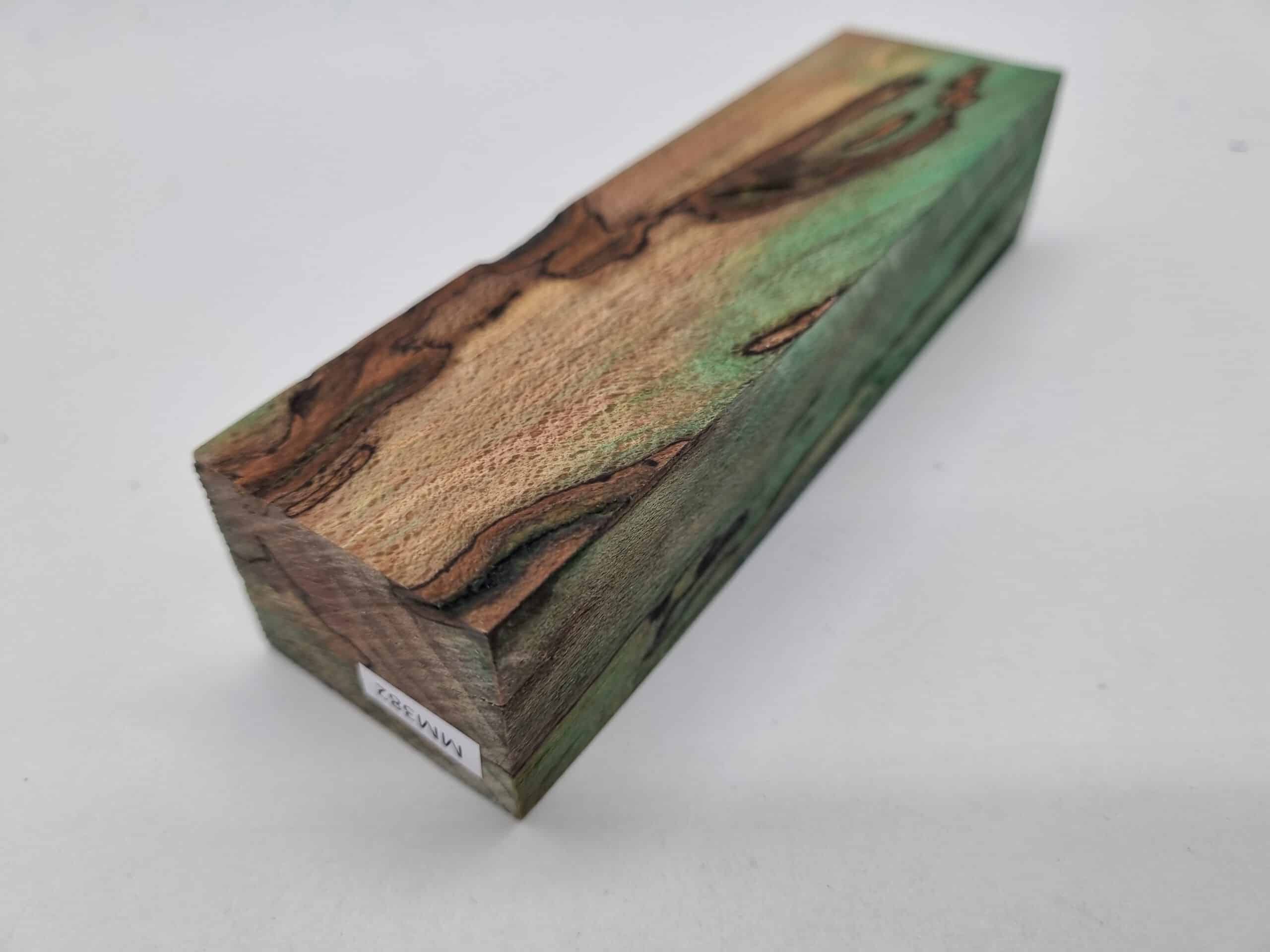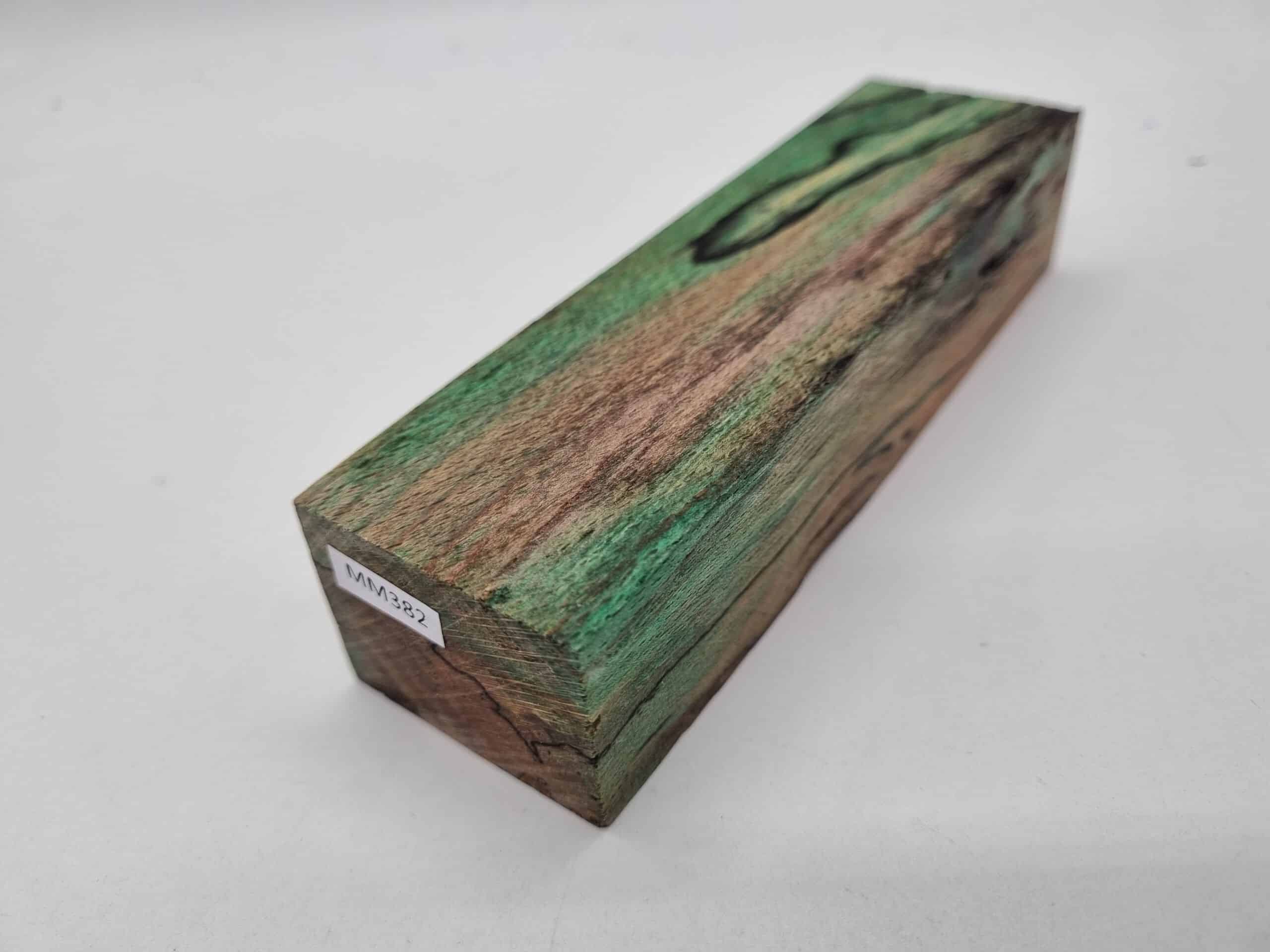 MM382 Buche gestockt rot grün stabilisiert 40mm x 30mm x 135mm. Um die Farbe und Struktur schön zu erkennen wurde die Oberfläche mit einer dünnen Schicht Schellack überzogen. Für die Perfekte Oberfläche finden Sie hier auch gutes Material. Beim Kauf erhalten Sie das abgebildete Stück.