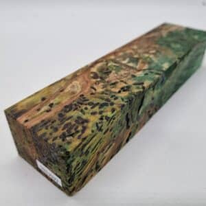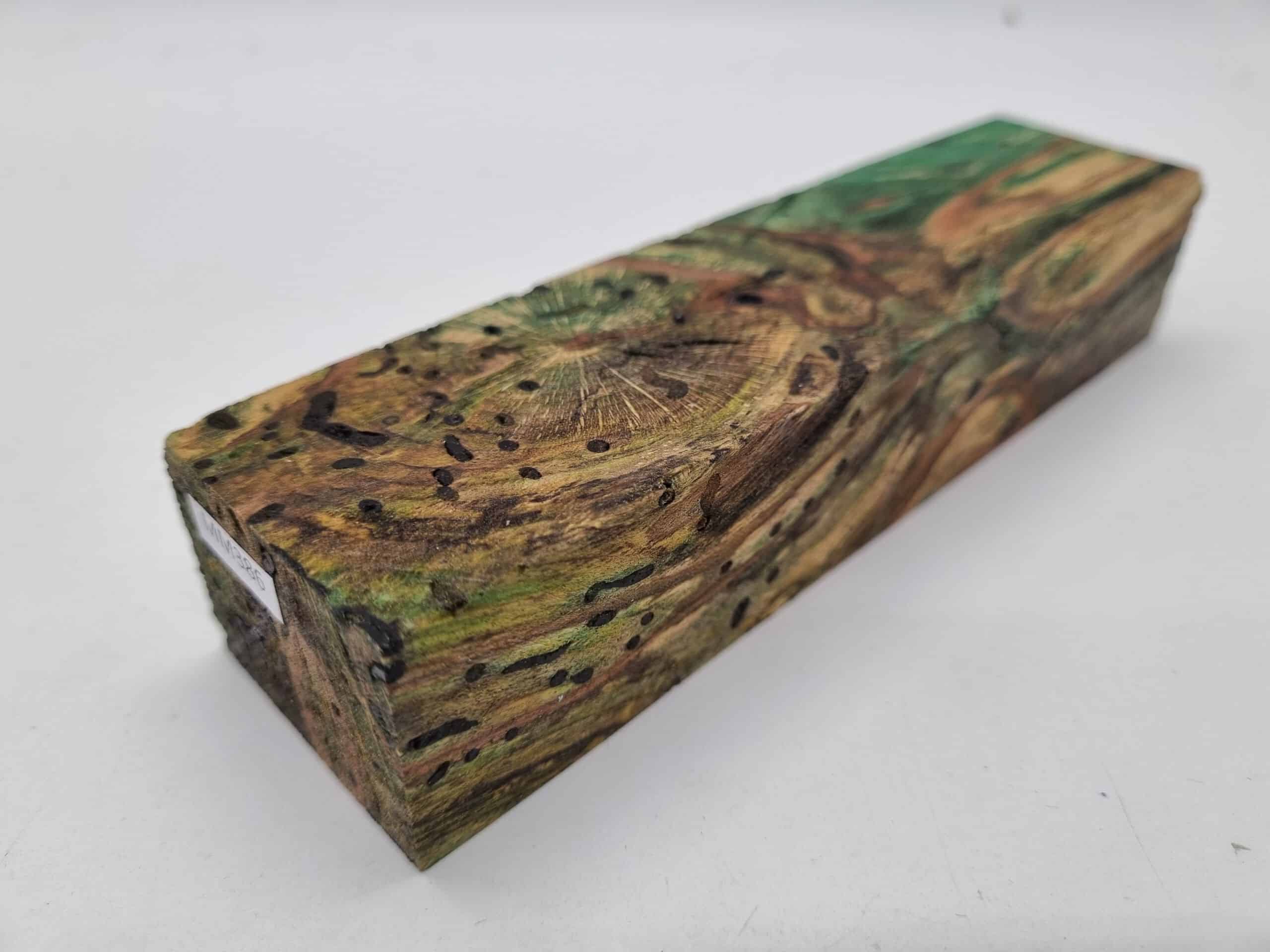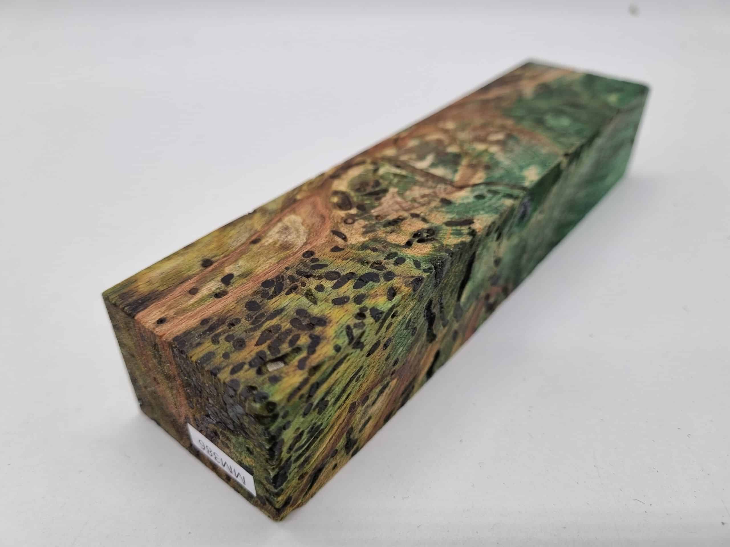 MM386 Buche gestockt grün gelb stabilisiert 40mm x 30mm x 155mm. Es sind Wurmlöcher mit stabilisiert. Um die Farbe und Struktur schön zu erkennen wurde die Oberfläche mit einer dünnen Schicht Schellack überzogen. Für ein perfektes Finish erhalten Sie hier sehr gutes Material. Beim Kauf erhalten Sie das abgebildete Stück.