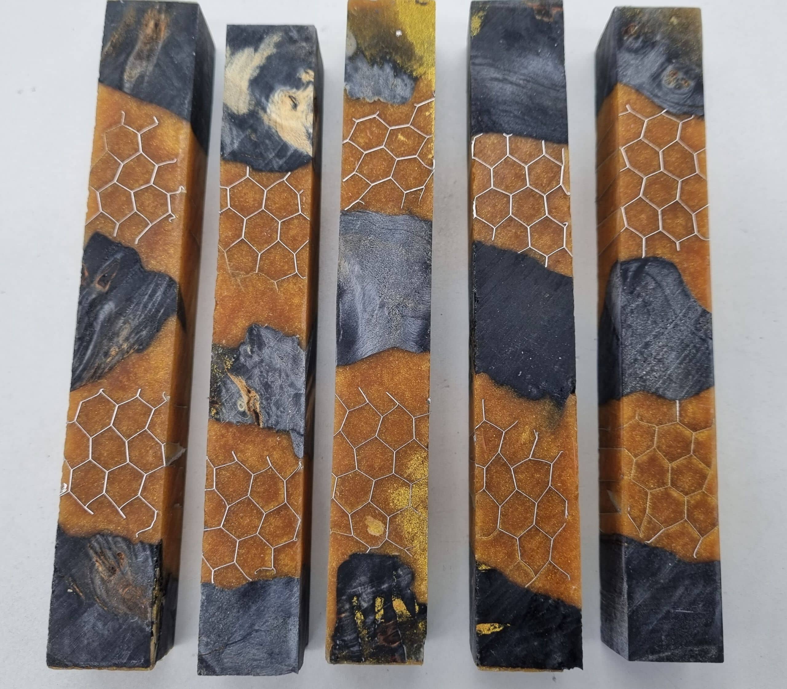 Penblank Hybrid Kastanie Aluwaben schwarz gold 20x20mm x 125mm. Das Holz wurde vor dem gießen stabilisiert. Der Penblank ist in 2 Teilen mit Harz und Aluwabe und 3 Teilen stabilsierte Kastanie. Im Shop finden Sie auch passende Stiftebausätze. Gutes Material für eine perfekte Oberfläche gibt es ebenso im Shop. Beim Kauf erhalten Sie ein Stück ähnlich in Farbe und Struktur.