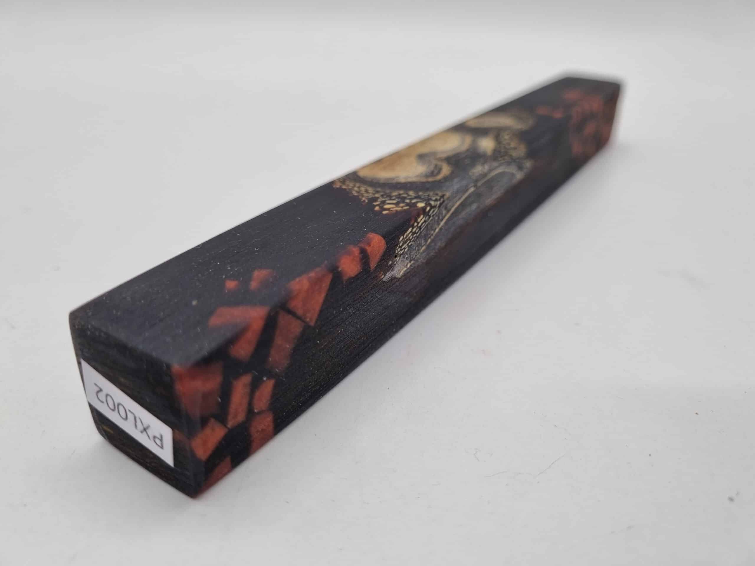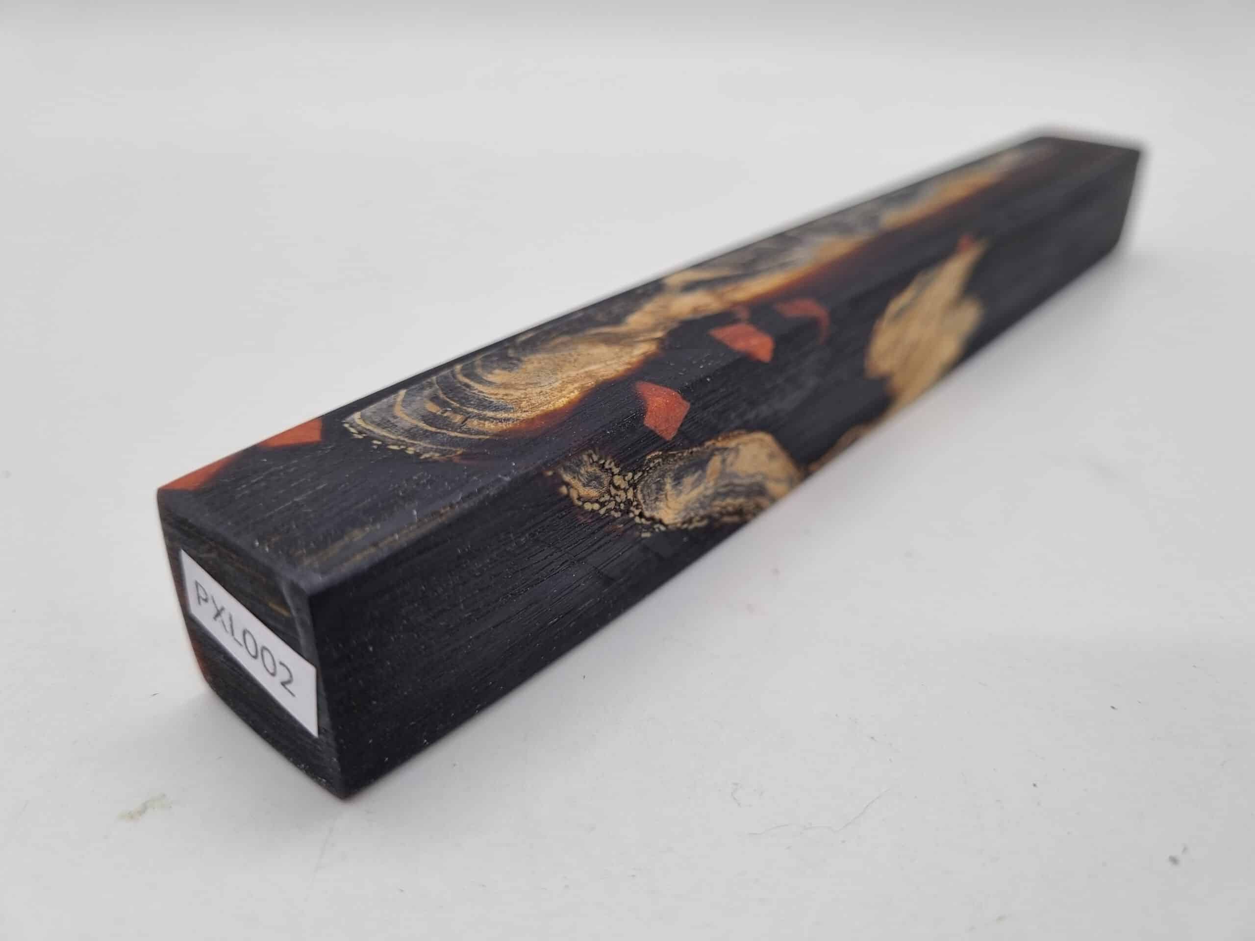 Penblank PXL002 gestockte Esche stabilisiert 21mm x 21mm x 180mm. Das Holz wurde vor dem gießen stabilisiert. Es wurden Epoxidharzstücke in der Farbe Kupferrot mit eingegossen. Beim Kauf erhalten Sie das abgebildete Stück. Im Shop finden Sie auch gutes Material für das Finish und geeignete Stiftebausätze.