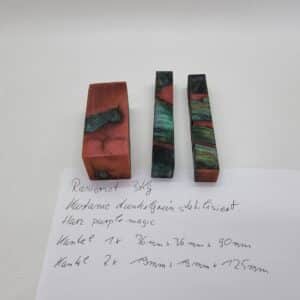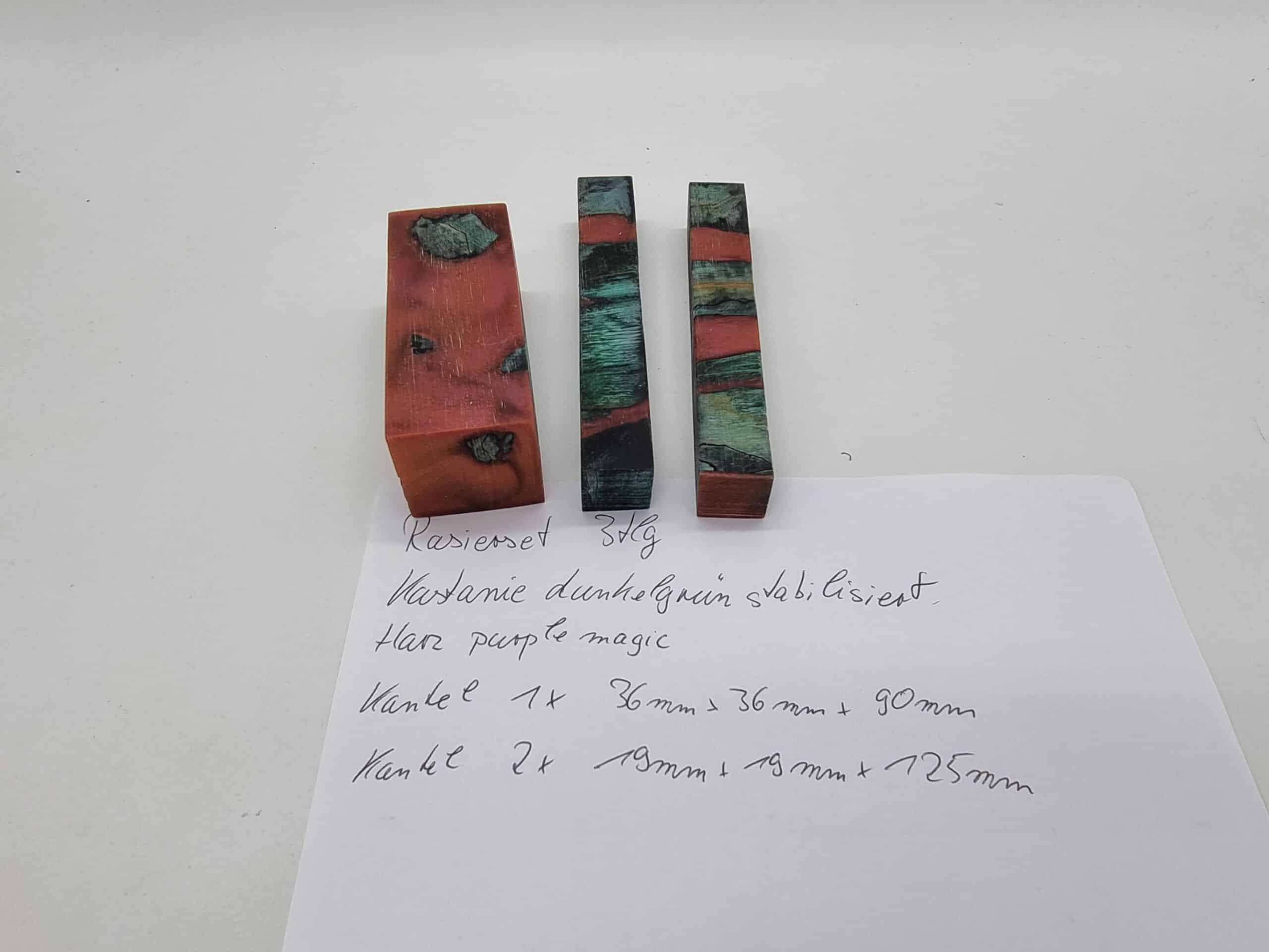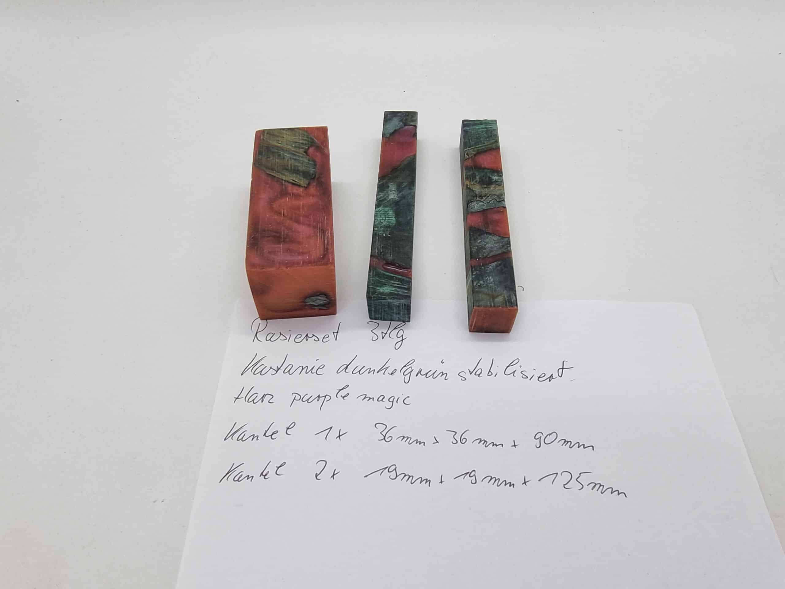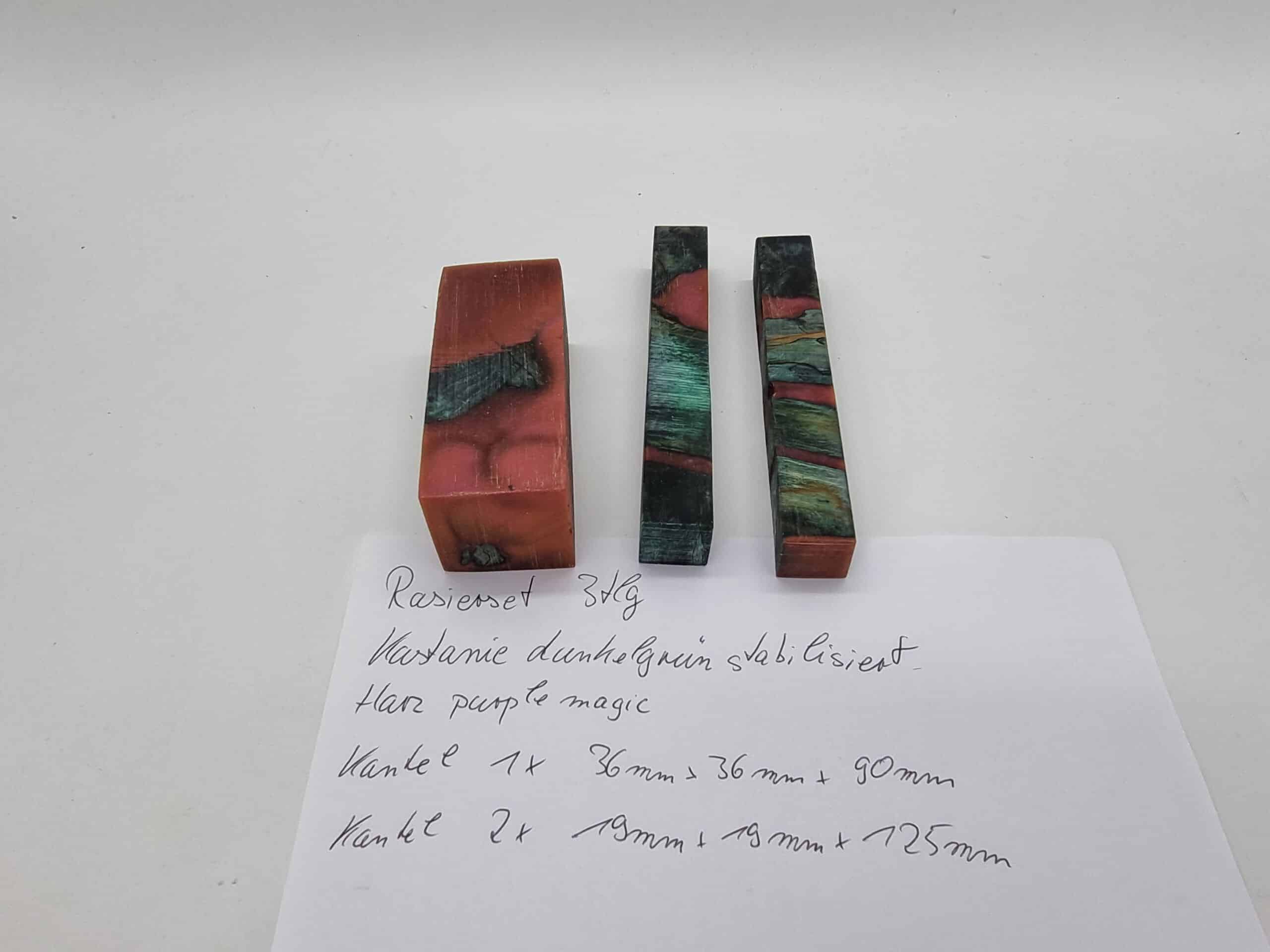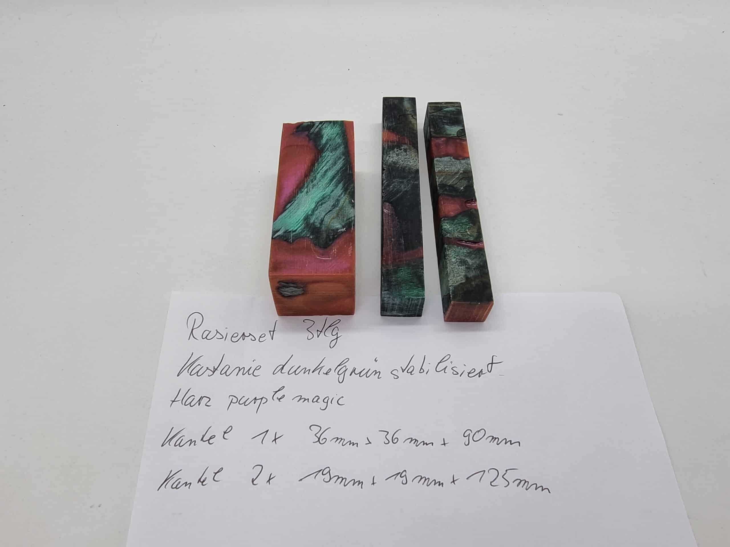 Rasierset 3tlg. Kastanie Hybrid grün/purple. Dieses Set besteht aus 3 Kantel, deren Maße sind 1x 36mm x 36mm x 90mm und 2x 19mm x 19mm x 125mm. Dieses Set passt genau für einen Pinsel, einen Rasierer und für den Ständer. Für die perfekte Oberfläche finden Sie auch hier bestes Material. Beim Kauf erhalten Sie das abgebildete Set.