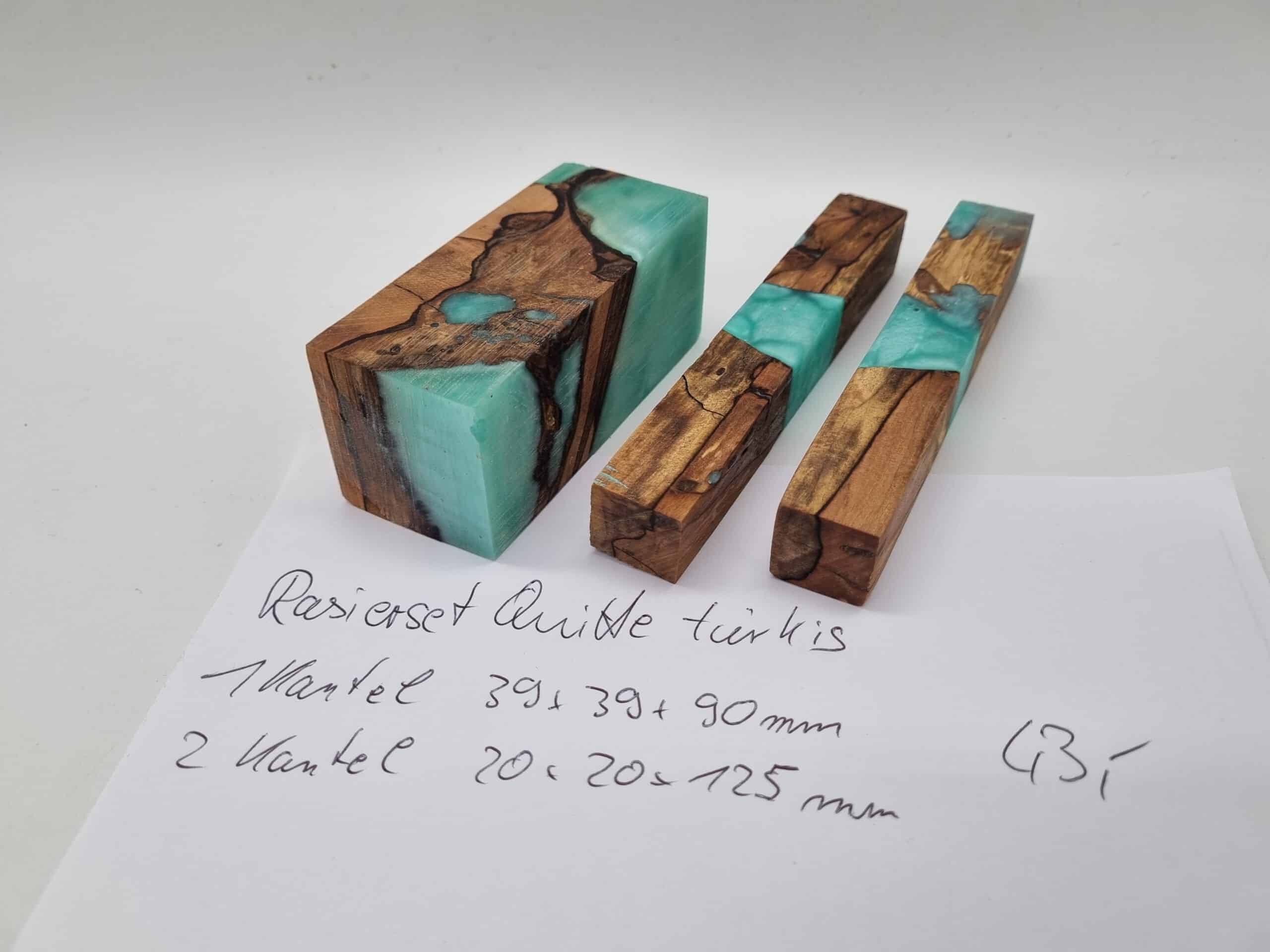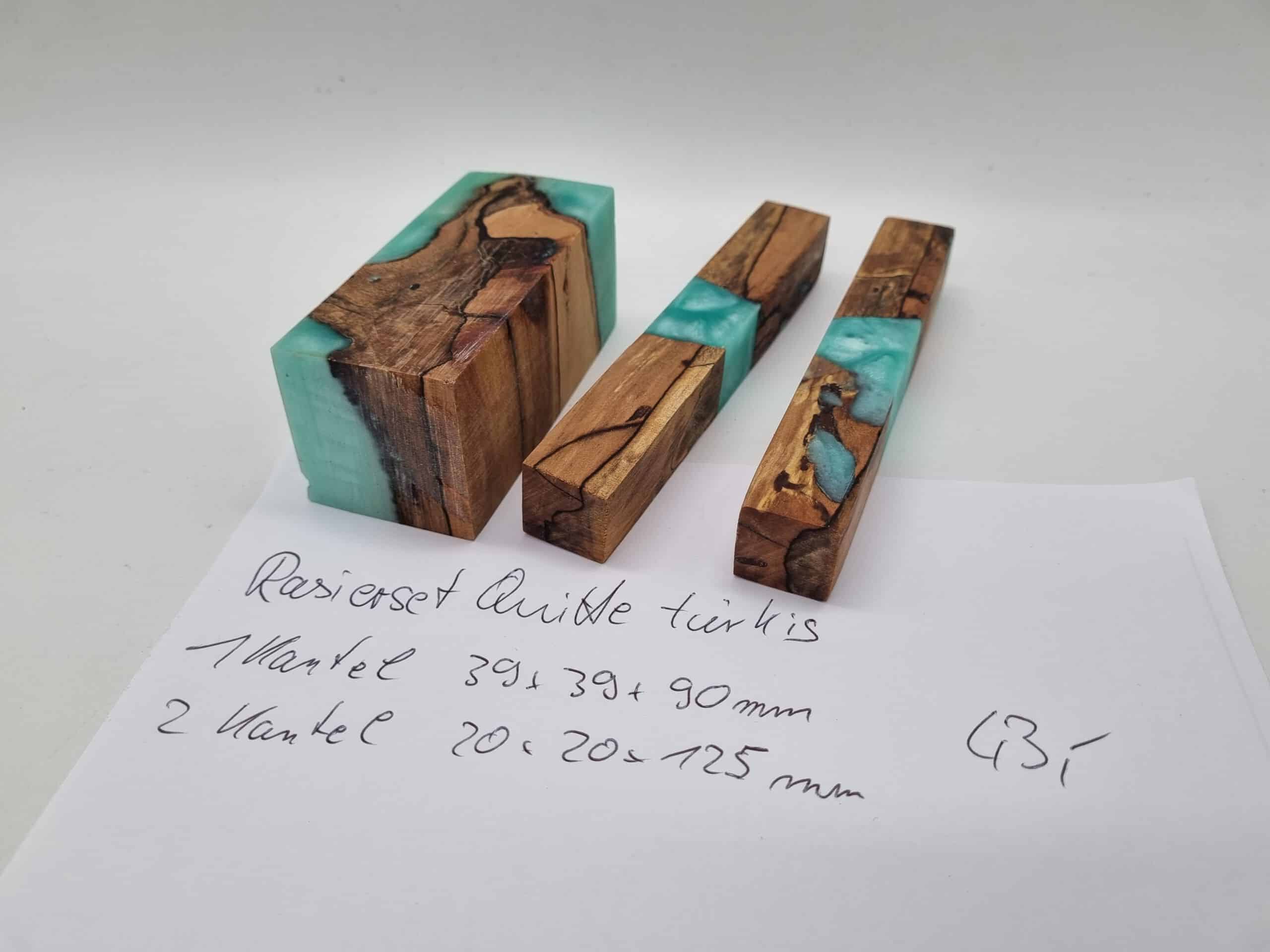 Rasierset 3tlg. Quitte Hybrid türkis. Dieses Set besteht aus 3 Kantel, deren Maße sind 1x 39mm x 39mm x 90mm und 2x 20mm x 20mm x 125mm. Dieses Set passt genau für einen Pinsel, einen Rasierer und für den Ständer. Für die perfekte Oberfläche finden Sie auch hier bestes Material. Beim Kauf erhalten Sie das abgebildete Set.