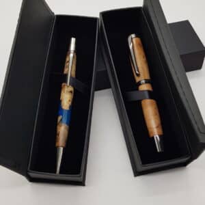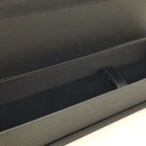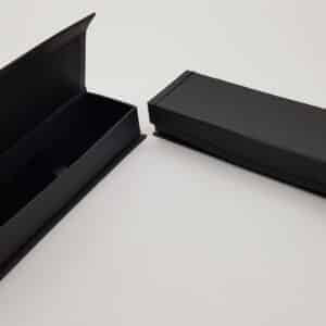 Stiftebox schwarz, mit klappbarem Deckel und einem Halteriemchen. In der Box ist Platz für einen Stift bis zu einer Länge von 16cm. Maße innen sind 160mm x 45mm, außen 55mm x 30mm x 170mm. Stift dient nur als Deko und ist nicht im Lieferumfang enthalten.