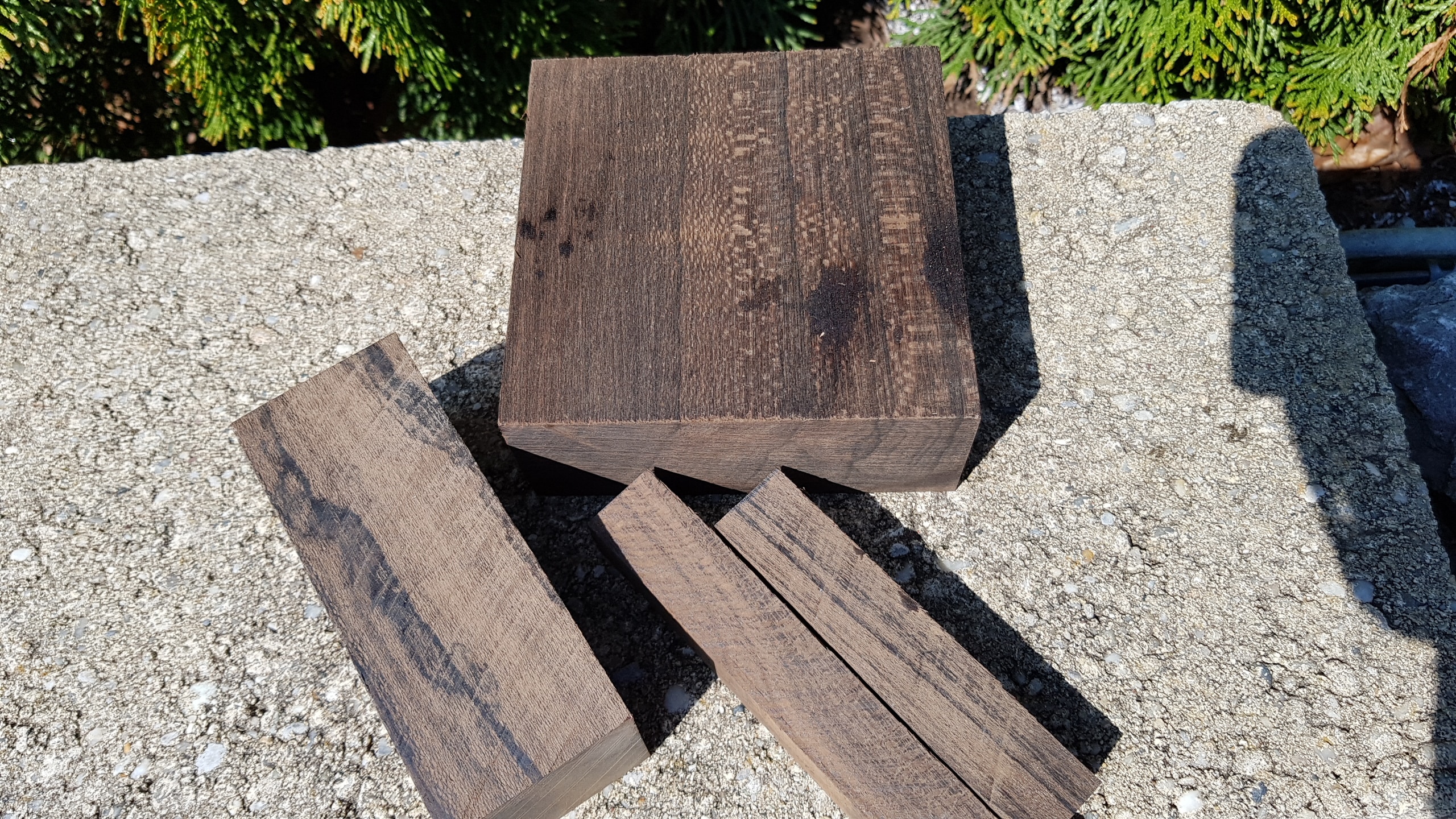 Hölzer für ein Rasierset, beinhaltet insgesamt 4 Stück. Ein Stück für Schälchen 10cm x 10cm x 4,2cm, für Rasierpinsel ein Stück 4,1cm x 4,1cm x 9,5cm, für Ständer 2cm x 2cm x 11,5cm und für Rasierer 2cm x 2cm x 9,5cm